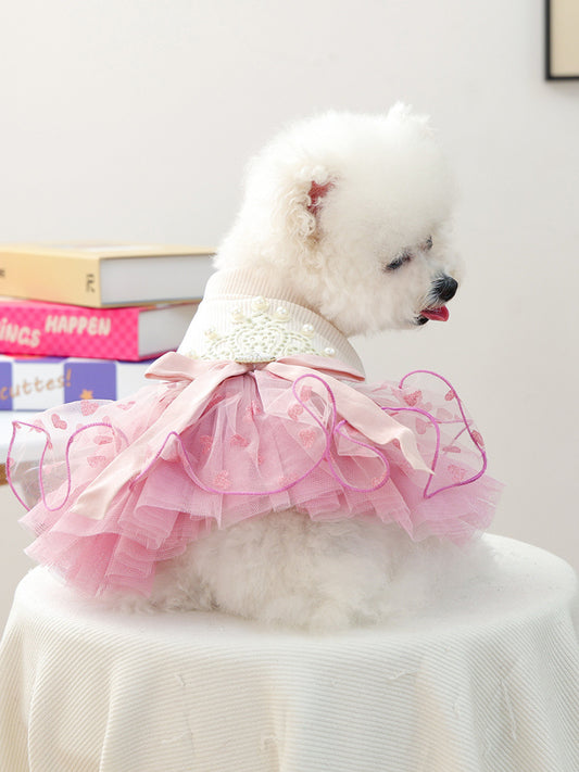 Pinlace Pearl Collar Pet Dress – Elegant Dog & Cat Party Outfit with Decorative Pearls